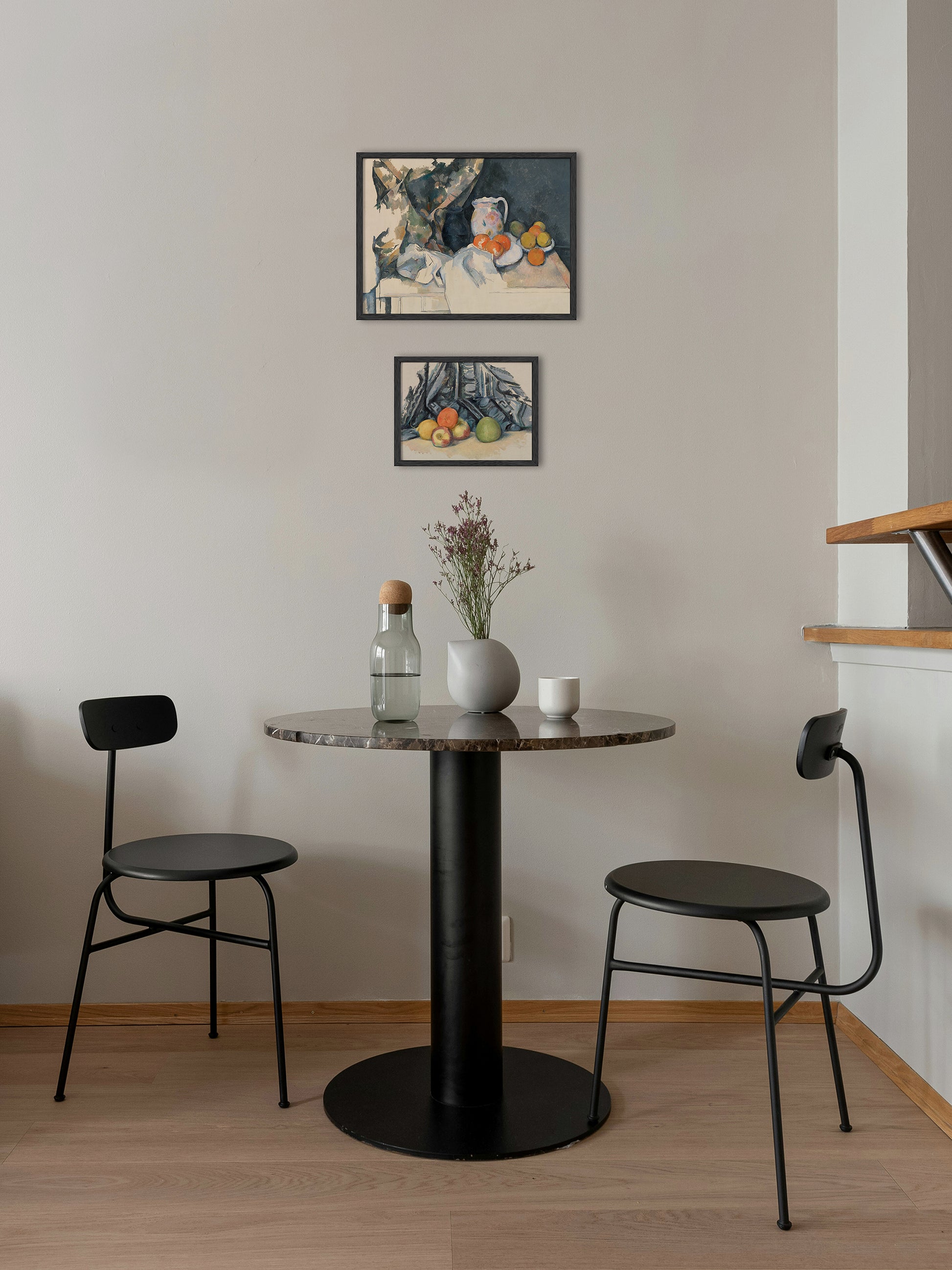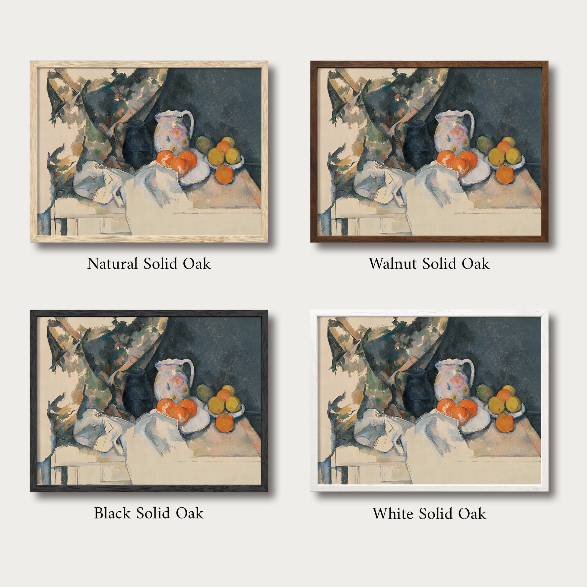 Originally painted in the late 1800s, this vintage still life captures a delicate tabletop arrangement of oranges beside a floral ceramic pitcher and softly draped linen. With expressive brushwork and a harmonious blend of warm oranges, soft blues, and muted greens, the artist creates a timeless study of color and form. Printed on archival matte paper, this artwork is available unframed or with our solid oak frame as an optional add-on. Perfect for kitchens, dining rooms, or cozy interiors, it adds a refined, painterly charm to your home décor.