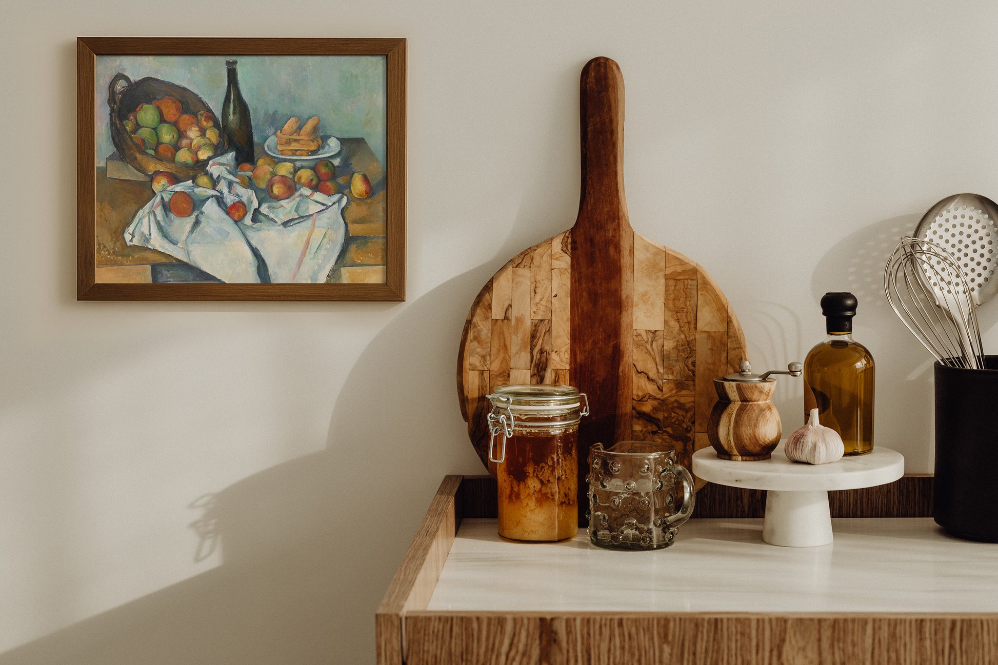Originally painted in the late 1800s, this vintage still life captures the rustic charm of a French tabletop adorned with apples, biscuits, and a dark wine bottle. The artist’s expressive brushwork and harmonious palette of green, red, and ochre tones bring warmth and depth to this timeless kitchen scene. Printed on archival matte paper, this artwork is available unframed or with our solid oak frame as an optional add-on. Perfect for dining rooms, kitchens, or cozy interiors, it adds a touch of European elegance to your wall décor.
