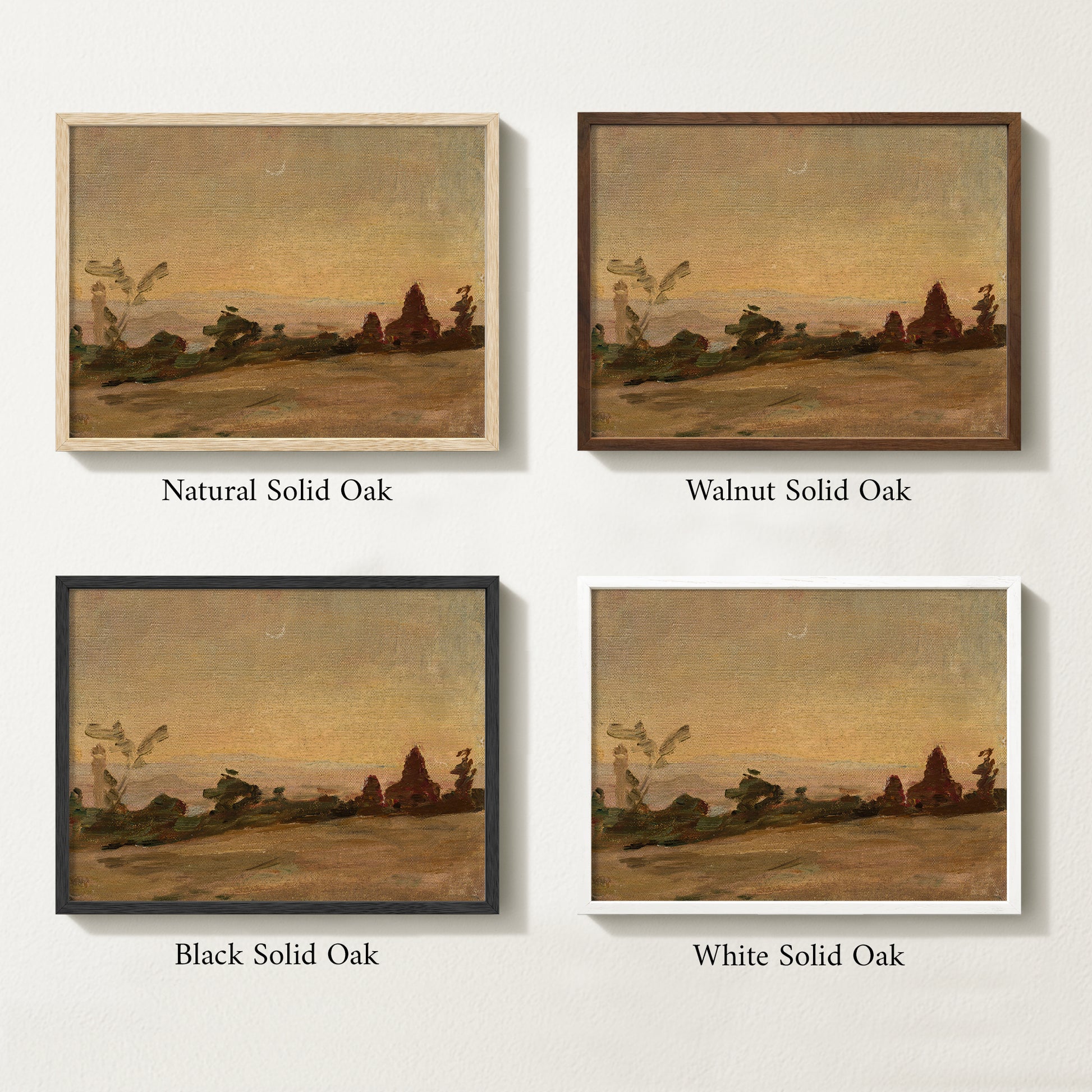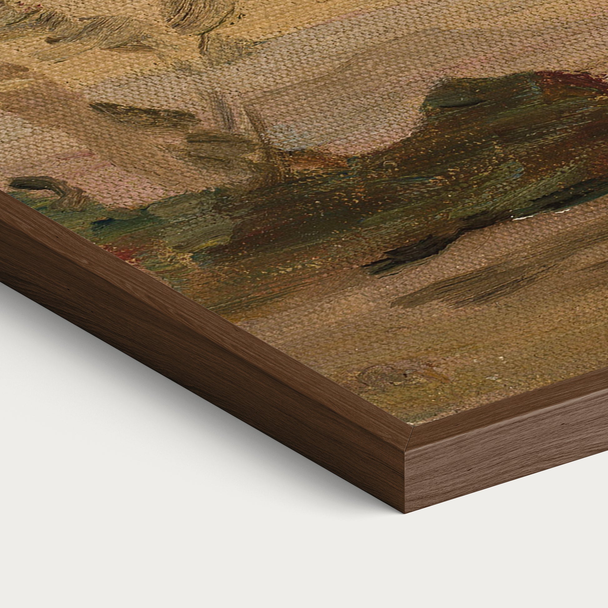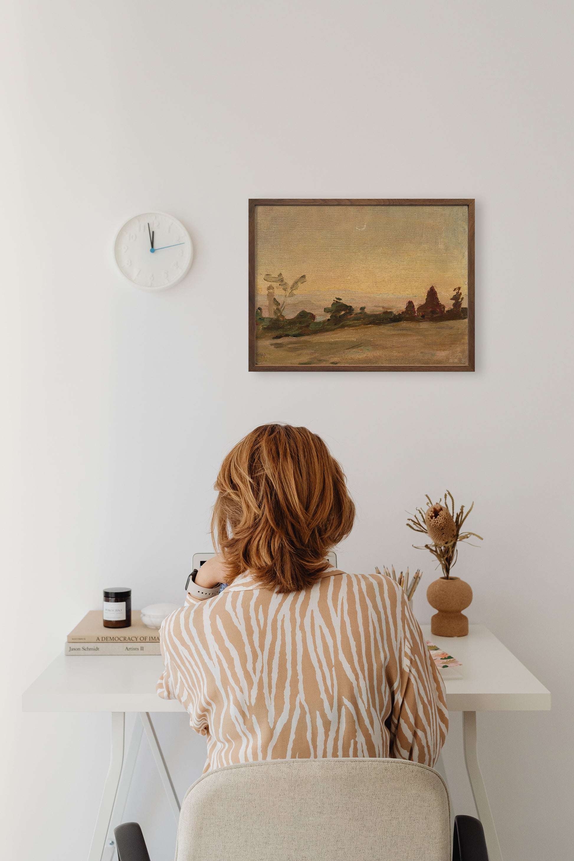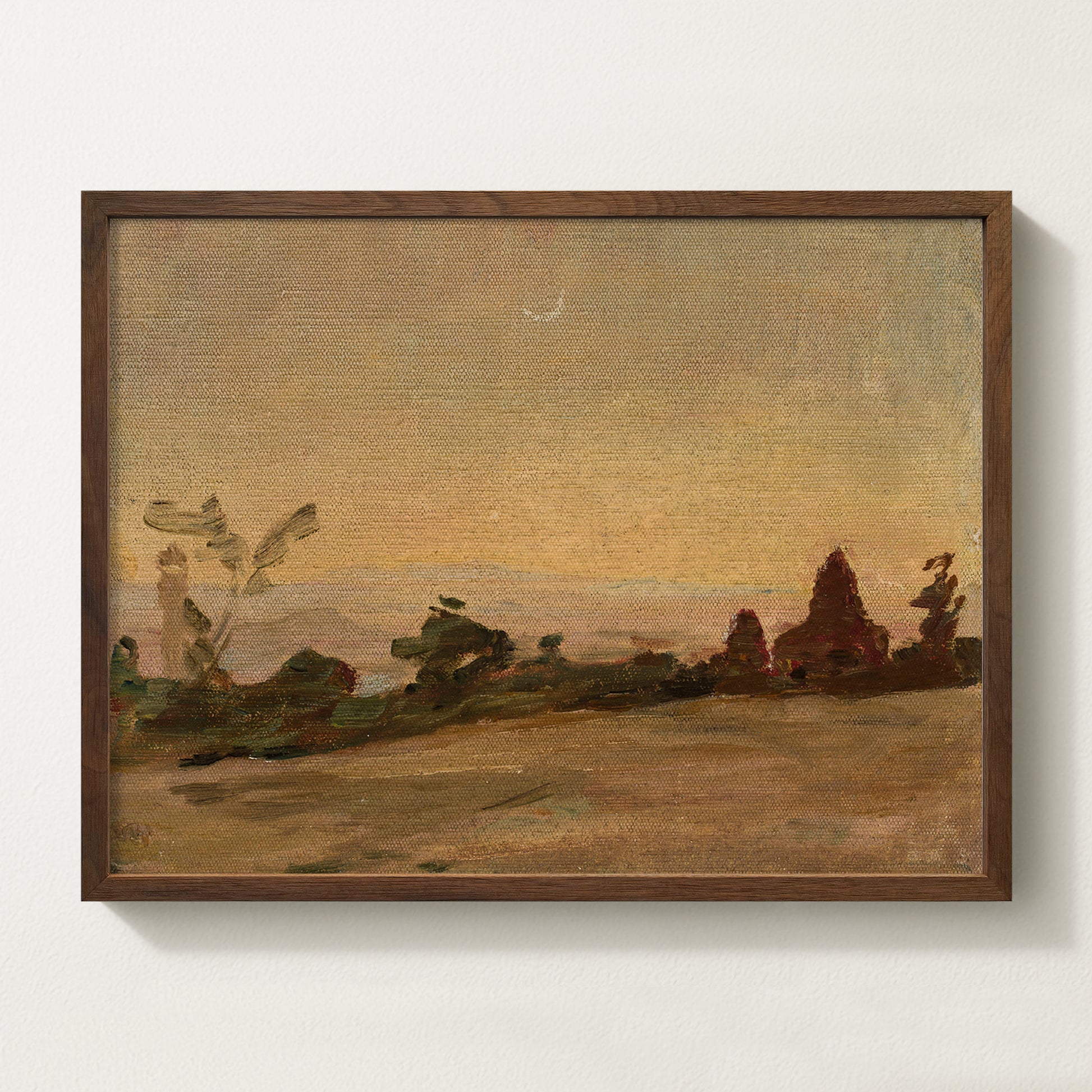 Originally painted in the early 1900s, this vintage landscape captures the soft stillness of dusk as the last light fades across the countryside. With warm golden hues and expressive, earthy brushstrokes, the artist evokes the quiet balance between daylight and evening—a moment of calm suspended in time. Printed on archival matte paper, this artwork is available unframed or with our solid oak frame as an optional add-on. Perfect for living rooms, hallways, or serene bedrooms, it adds a touch of warmth and refinement to any wall.