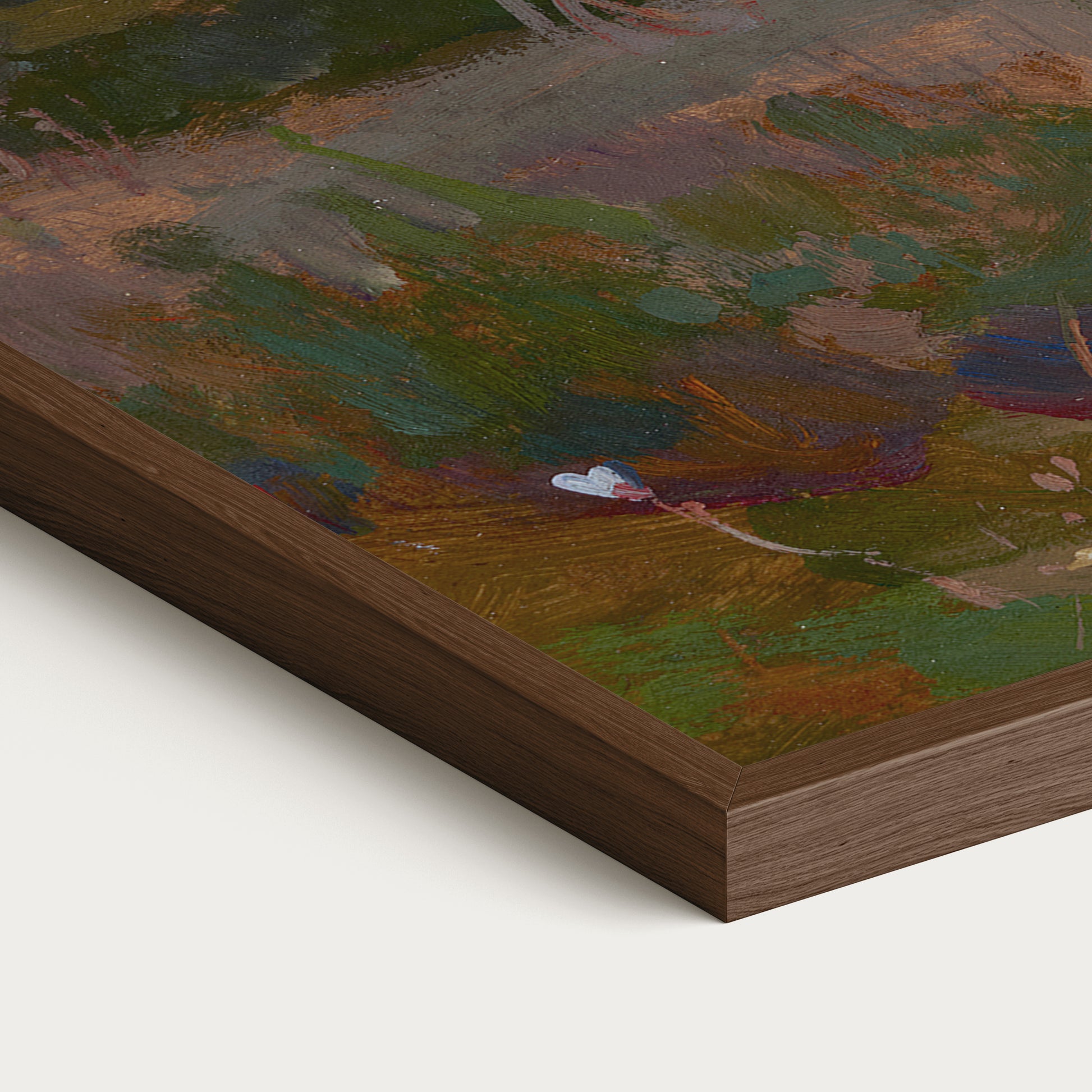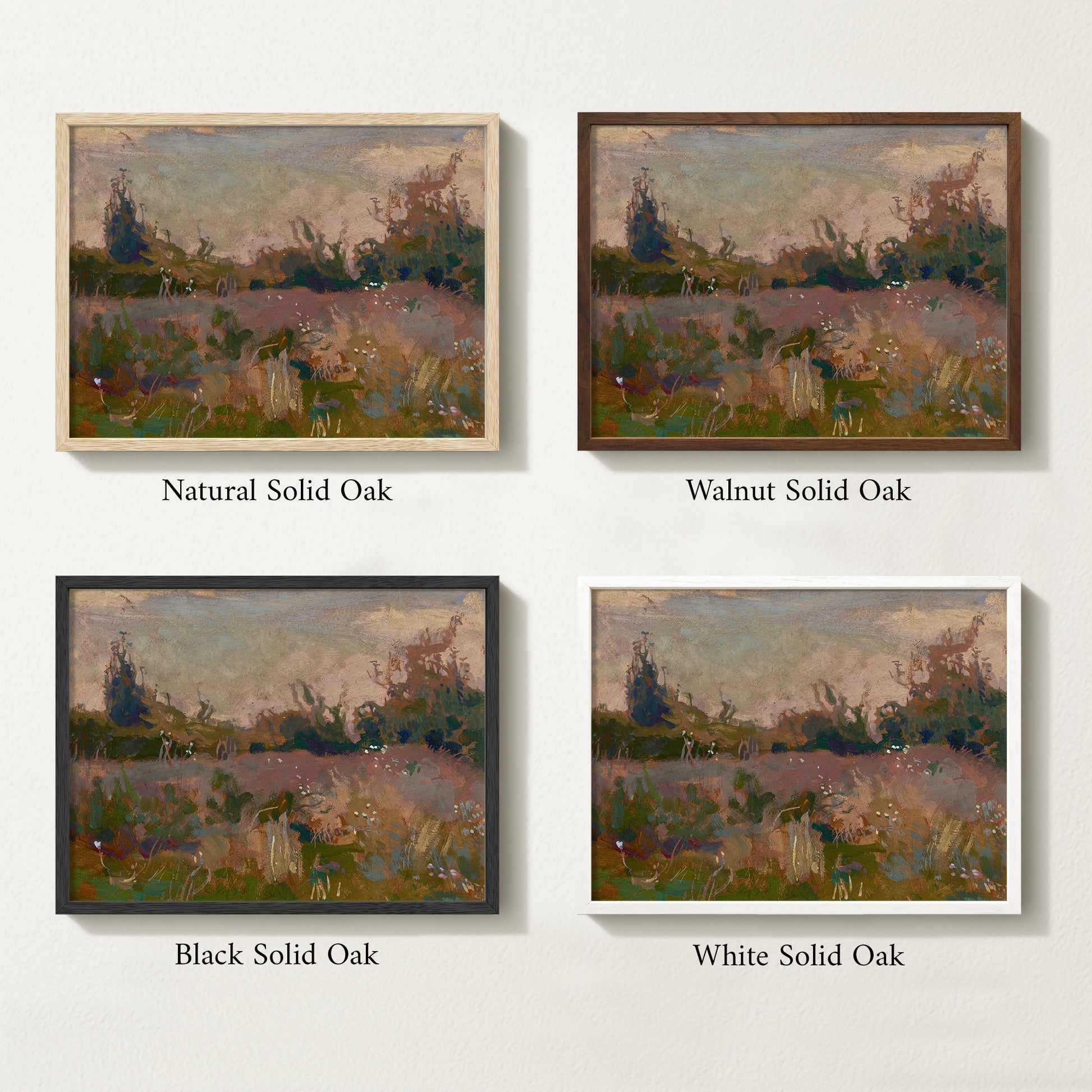 Originally painted in the early 1900s, this vintage landscape captures a quiet wildflower field bathed in soft evening light. With expressive brushstrokes and a muted palette of rose, sage, and warm earth tones, the artist evokes the gentle stillness of nature at dusk. Printed on archival matte paper, this artwork is available unframed or with our solid oak frame as an optional add-on. Perfect for living rooms, bedrooms, or cozy reading corners, it brings a warm, nostalgic touch to your home décor.