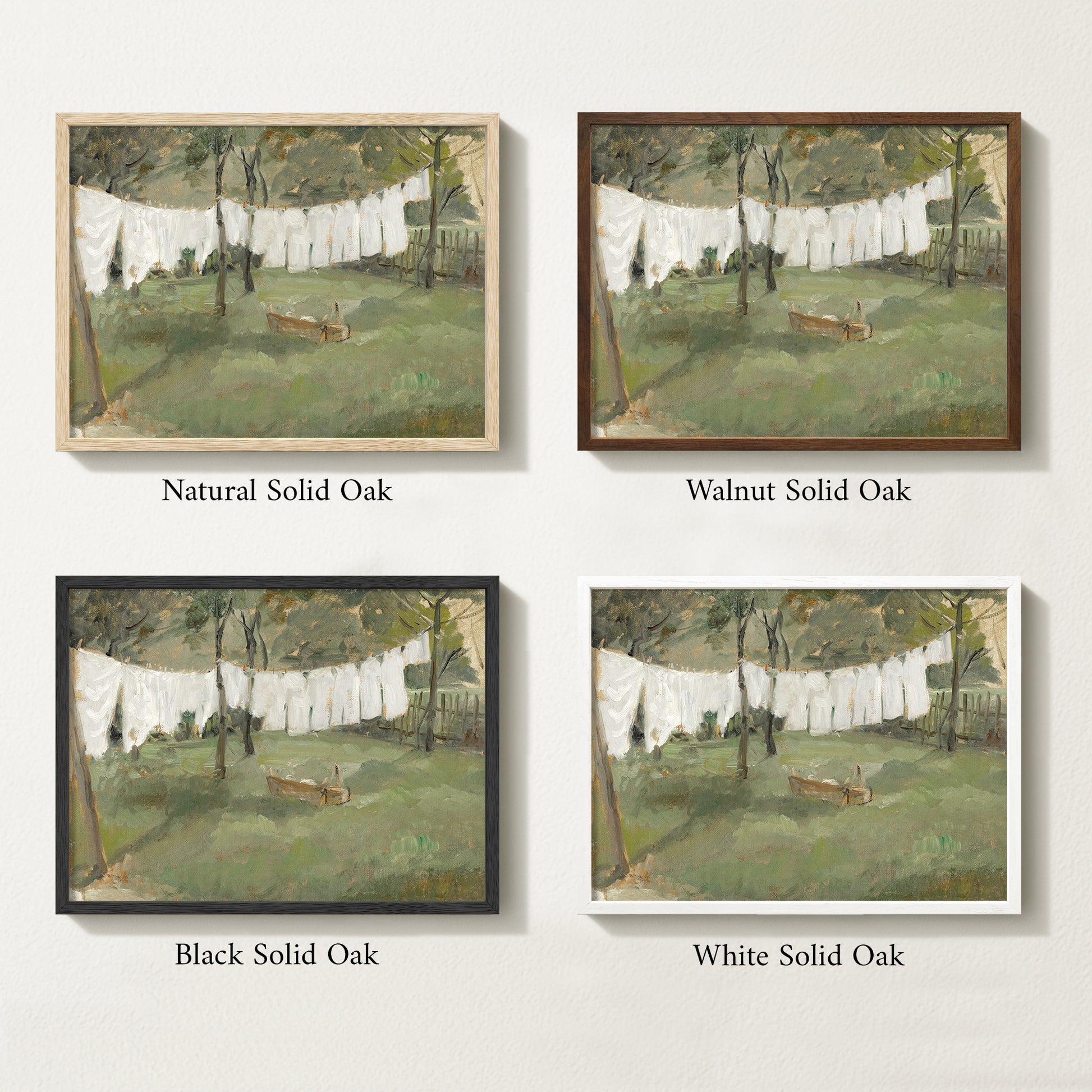 Rustic Laundry Line Painting: There’s something timeless about laundry on the line — crisp white linens drifting in the breeze, captured here in soft, painterly brushstrokes. This vintage wall art print brings a quiet countryside charm into modern interiors, blending nostalgia with a lived-in feel. Printed on archival quality paper and available with a solid oak frame, it’s the perfect piece to style in your laundry room or part of a gallery wall. A mix of cottagecore aesthetic and farmhouse wall decor, this artwork turns the everyday into art — making your space feel both relaxed and refined.