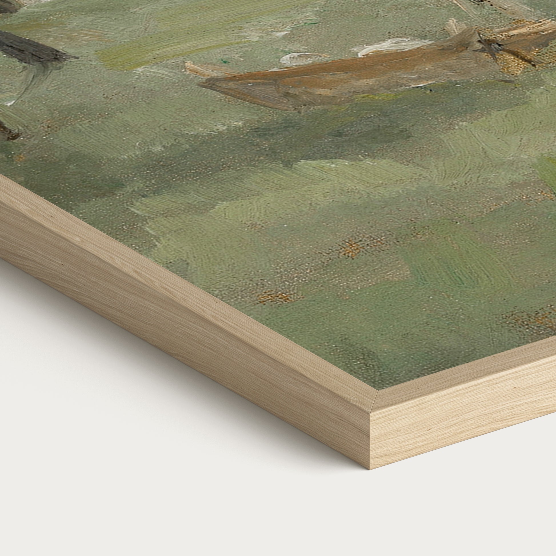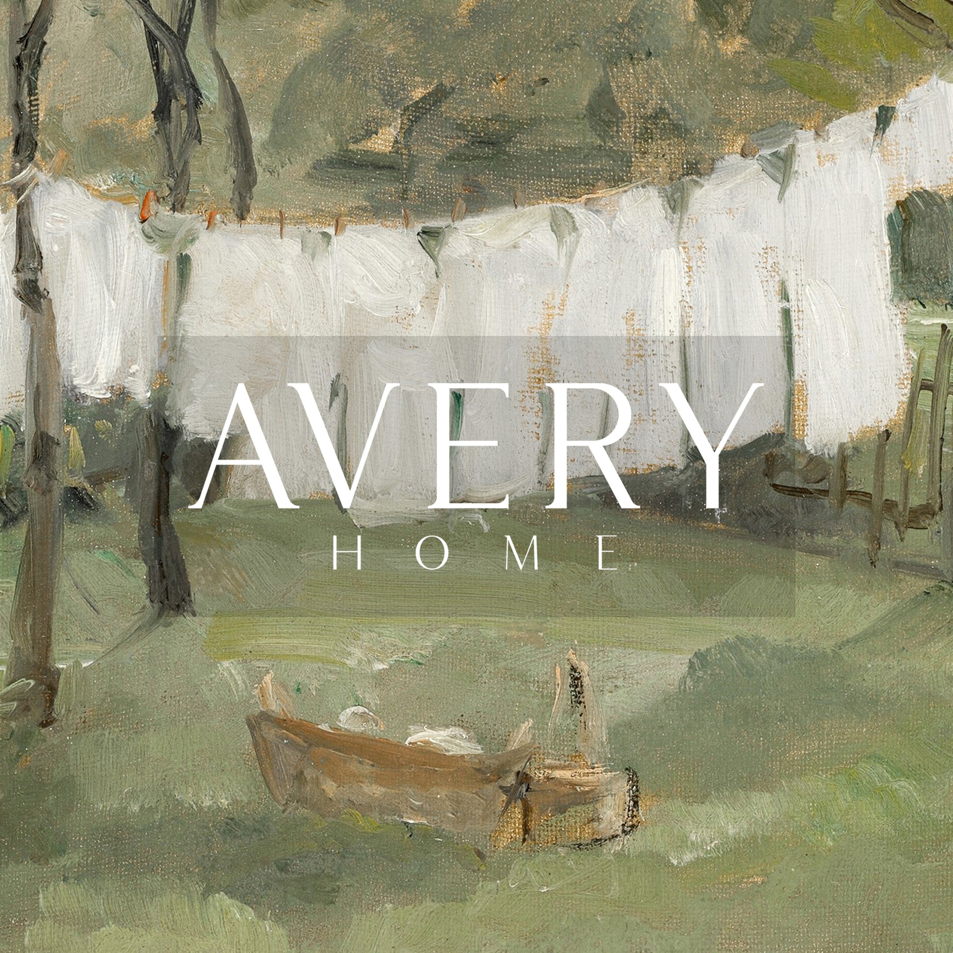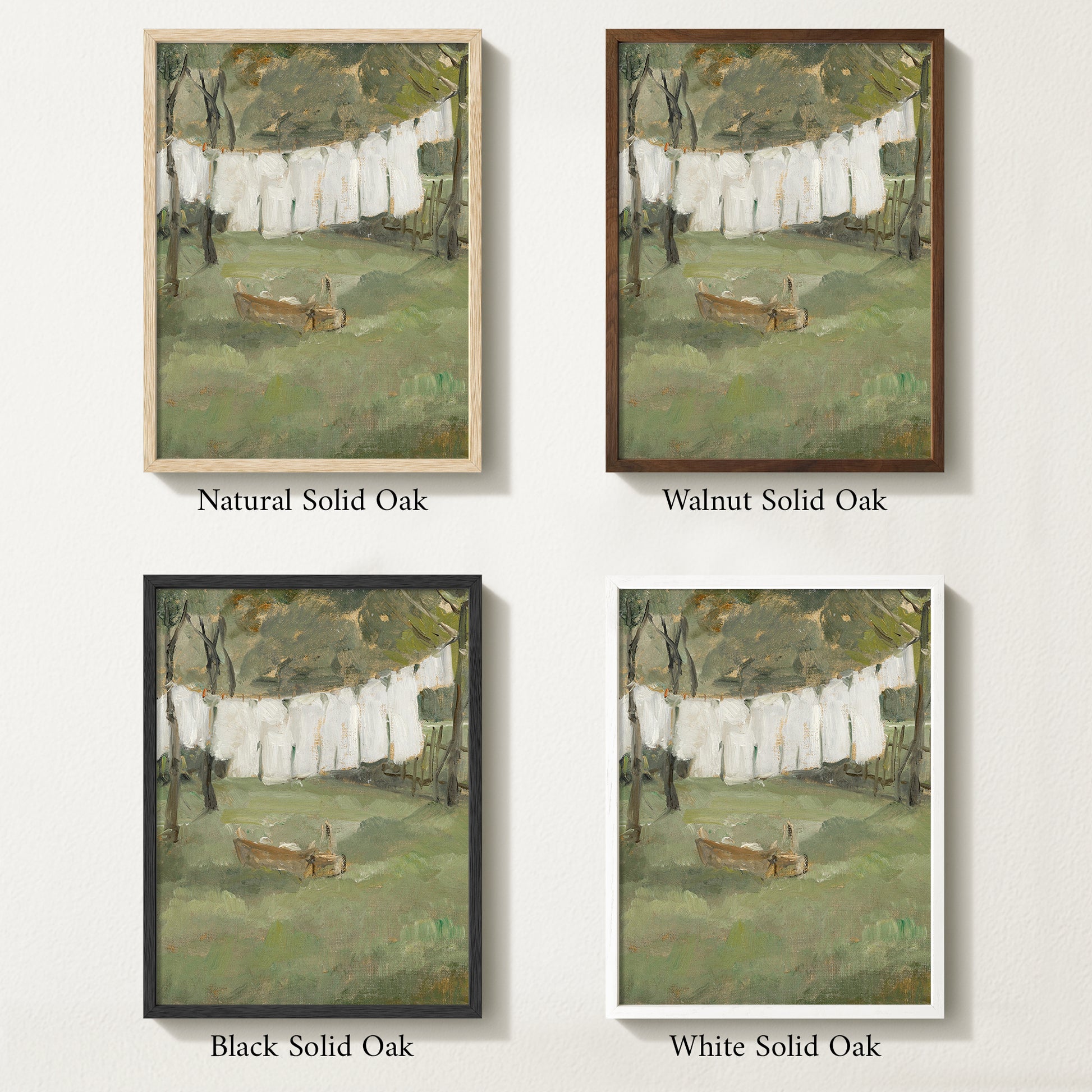 Originally painted in the late 1800s, this vintage garden scene captures freshly washed linens hanging from a clothesline beneath tall trees, evoking the quiet rhythm of everyday domestic life. Soft brushstrokes and a gentle palette of greens, creams, and muted earth tones create a sense of calm simplicity, where sunlight and fresh air define the moment.