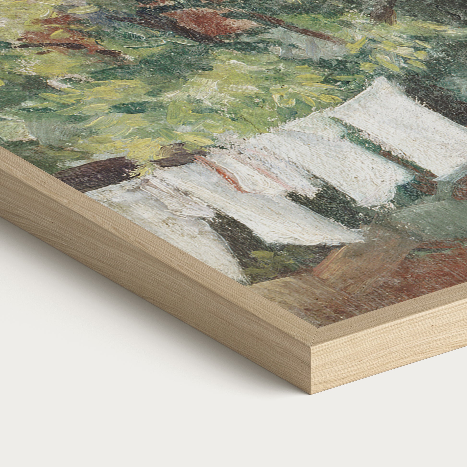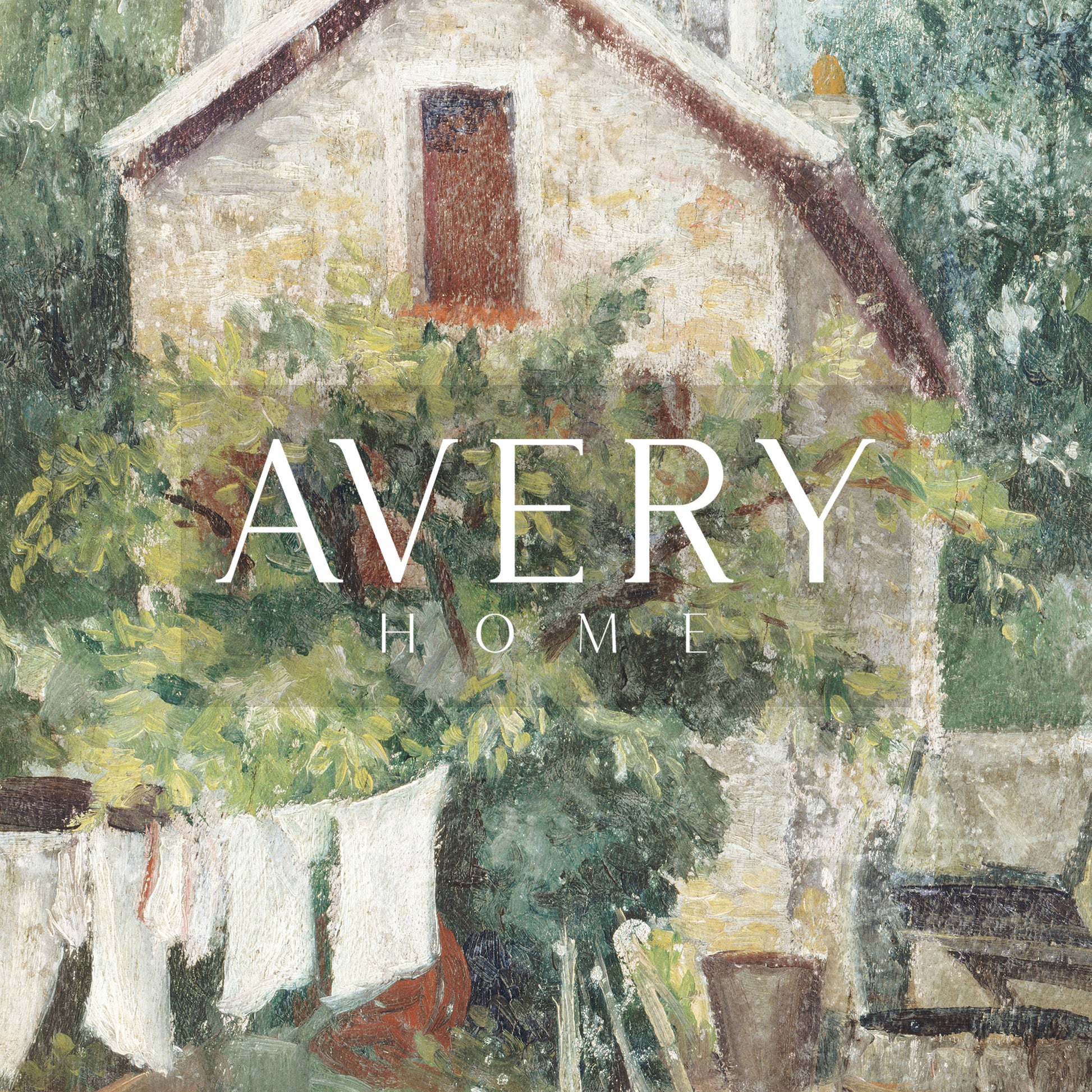 Originally painted in the late 1800s, this vintage set of two garden laundry scenes captures the quiet beauty of everyday domestic life. One artwork depicts freshly washed linens hanging beneath trees in a peaceful garden, while the other shows a cottage yard with laundry drying beside lush greenery. Soft brushstrokes and a calming palette of greens, creams, and warm earth tones evoke a slower, more intentional rhythm of life.